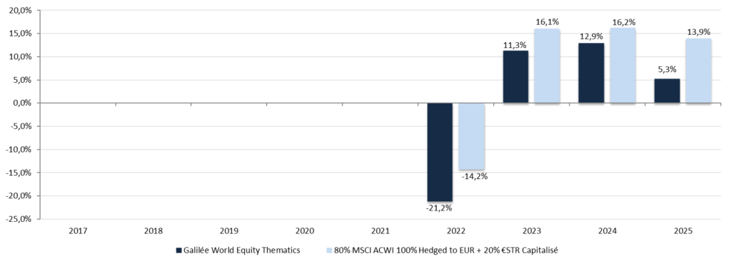 Cet OPCVM est géré activement et de manière discrétionnaire. Il a pour objectif de dégager une performance nette de frais supérieure à l’indicateur de référence à travers une gestion dynamique, en s’exposant essentiellement aux marchés d’actions par le biais de fonds et ETF thématiques, sur une durée de placement recommandée minimum de 5 ans.