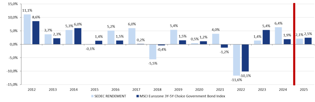 La performance est calculée coupons et dividendes réinvestis, nette de frais de gestion directs et indirects et hors frais d’entrée et de sortie. Celle de l’indicateur de référence est calculée dividendes réinvestis à compter de 2013.