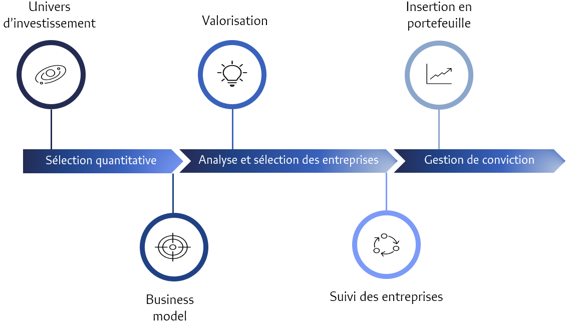 Notre philosophie d’investissement repose sur un processus d’analyse fondamentale des sociétés, dont la stratégie et les avantages compétitifs nous permettent d’anticiper des perspectives de croissance supérieures à la moyenne du marché sur un horizon de 3 à 5 ans.